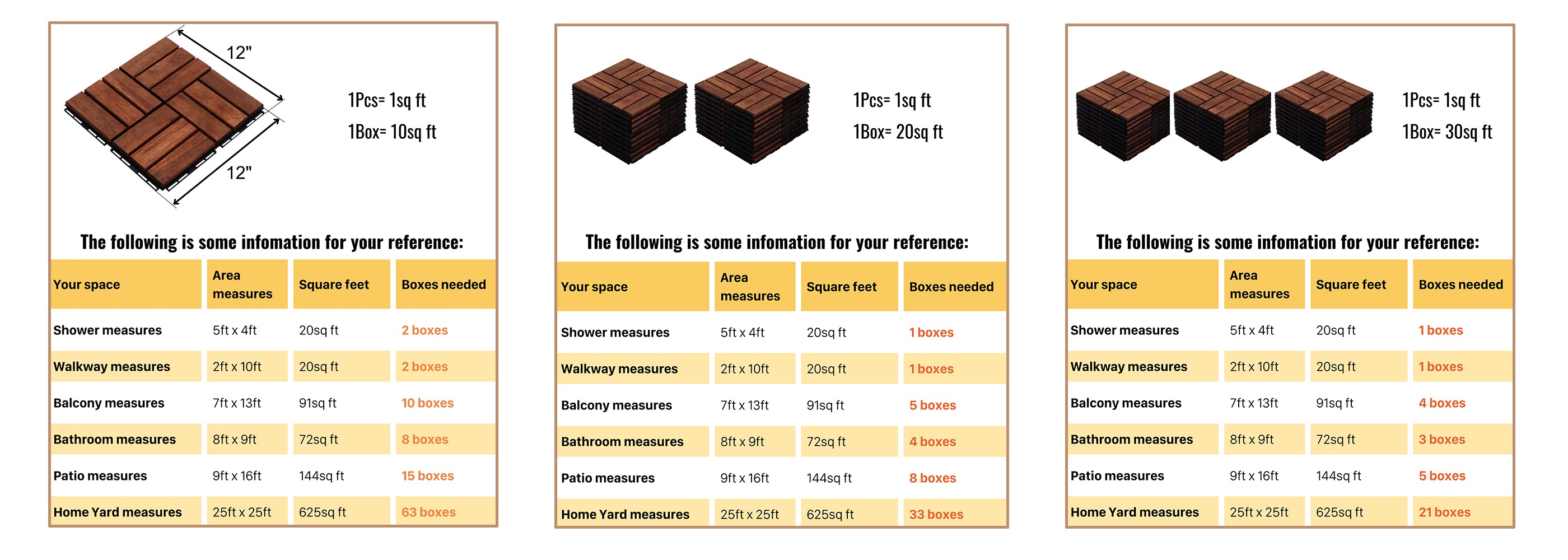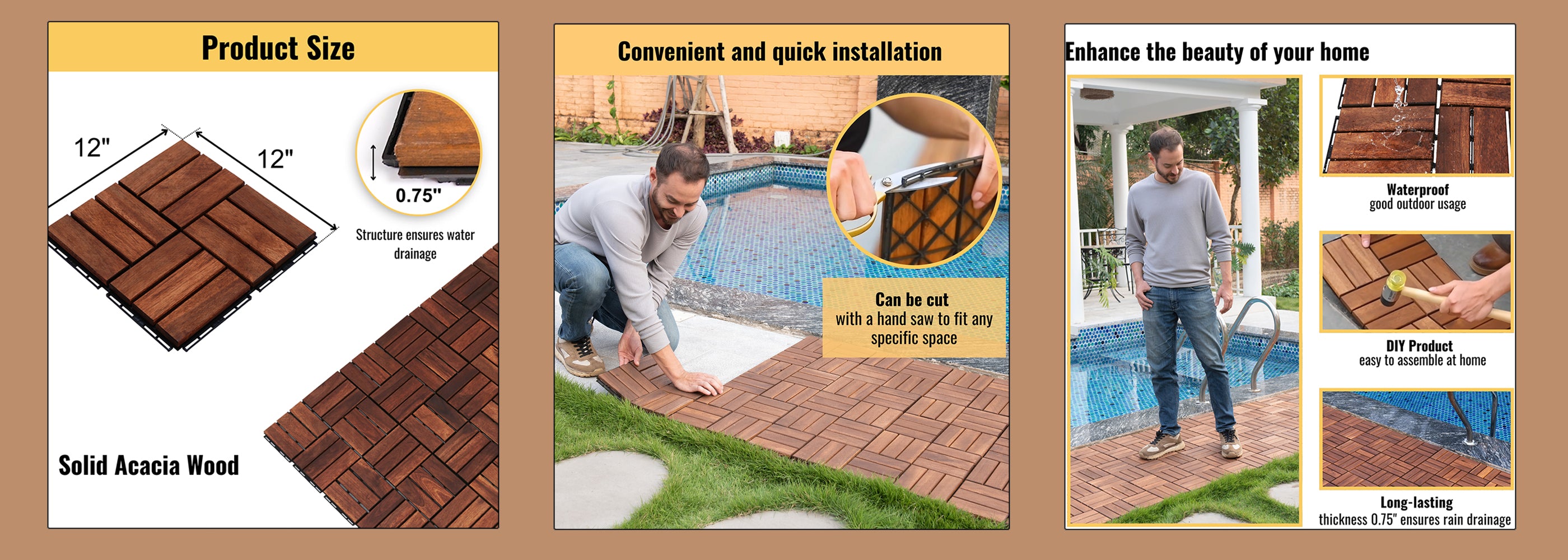 30-Day ReturnsPerfect Dimensions:Each tile is a square with a size of 12 inches × 12 inches and a total thickness of 0.75 inches. The wooden part is 0.47 inches thick, and the plastic part is 0.28 inches thick. This structure is conducive to drainage during the rainy season.